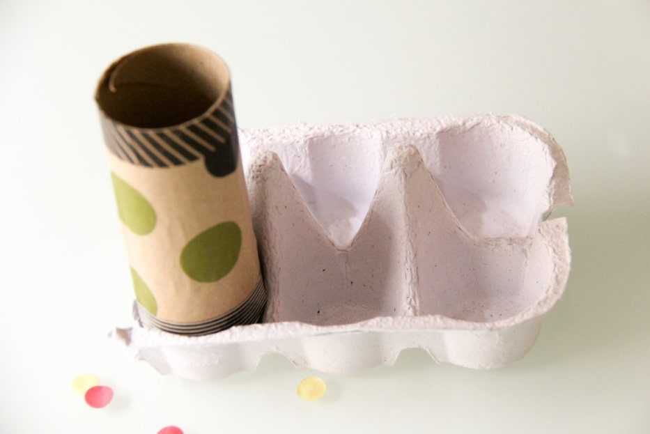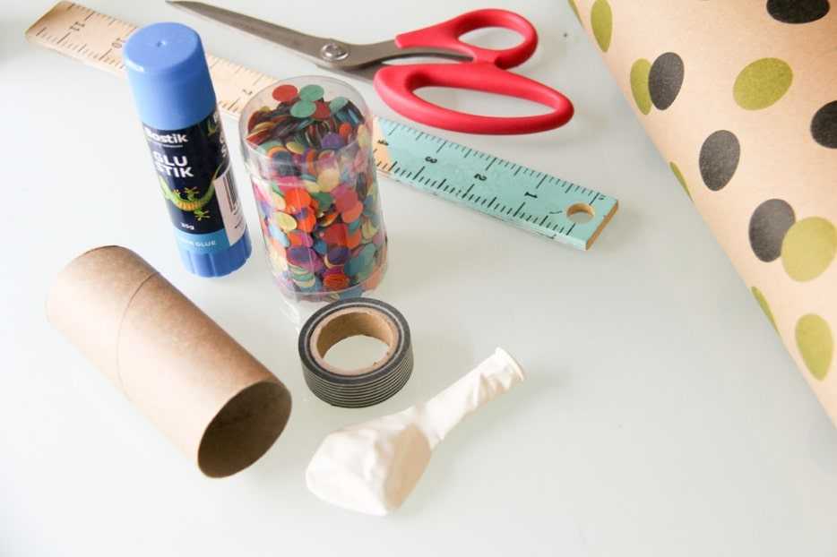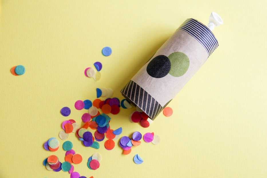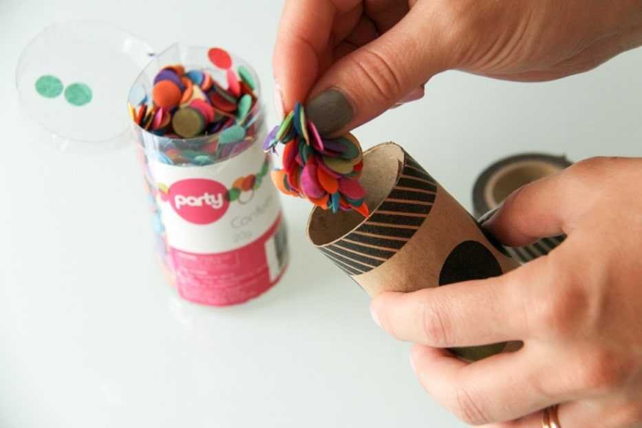 На данном этапе можно использовать уже готовые конфетти или же сделать их самостоятельно. Для этого понадобится всего лишь дырокол и остатки цветной бумаги. Когда они будут готовы, заполняем втулку до половины.