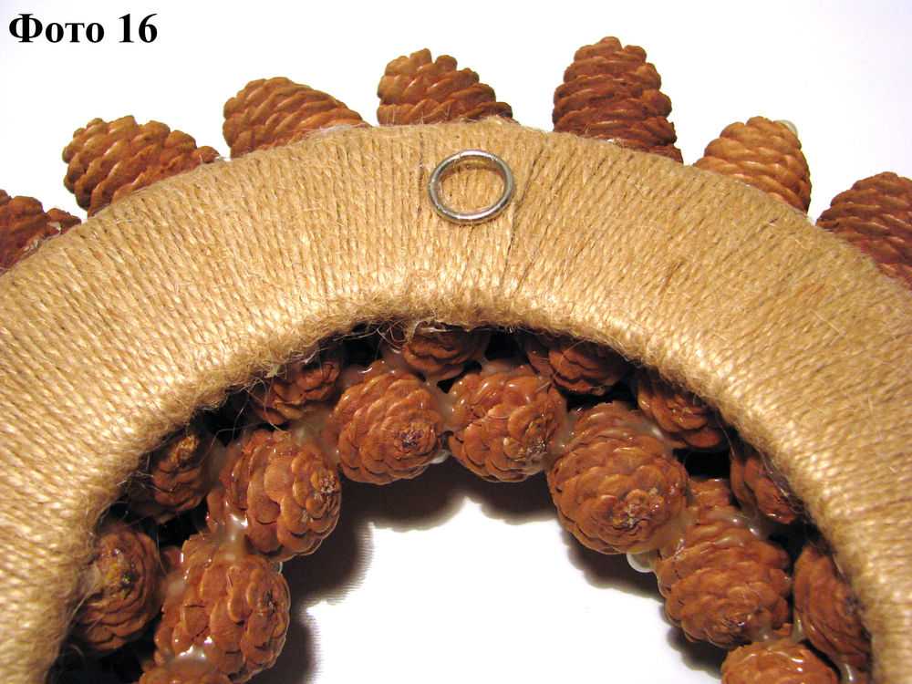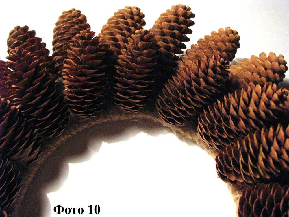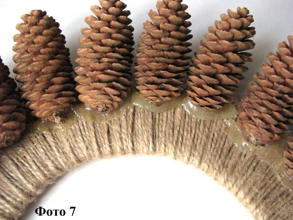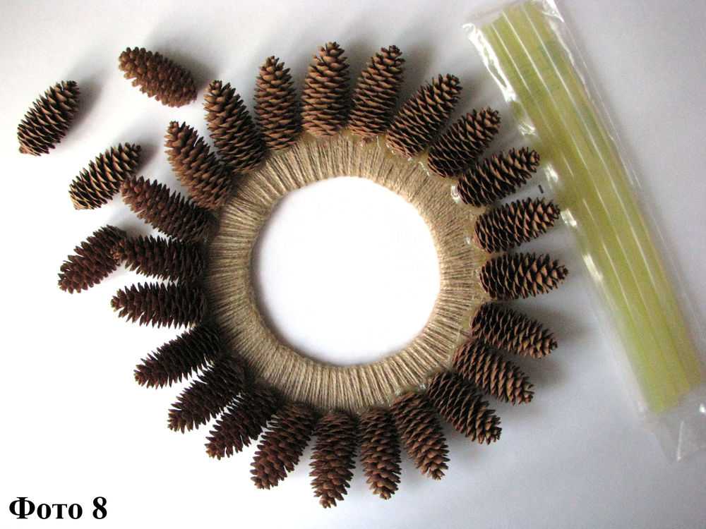 Закрепляем шишки у внешнего круга основы, используя клеевой пистолет.