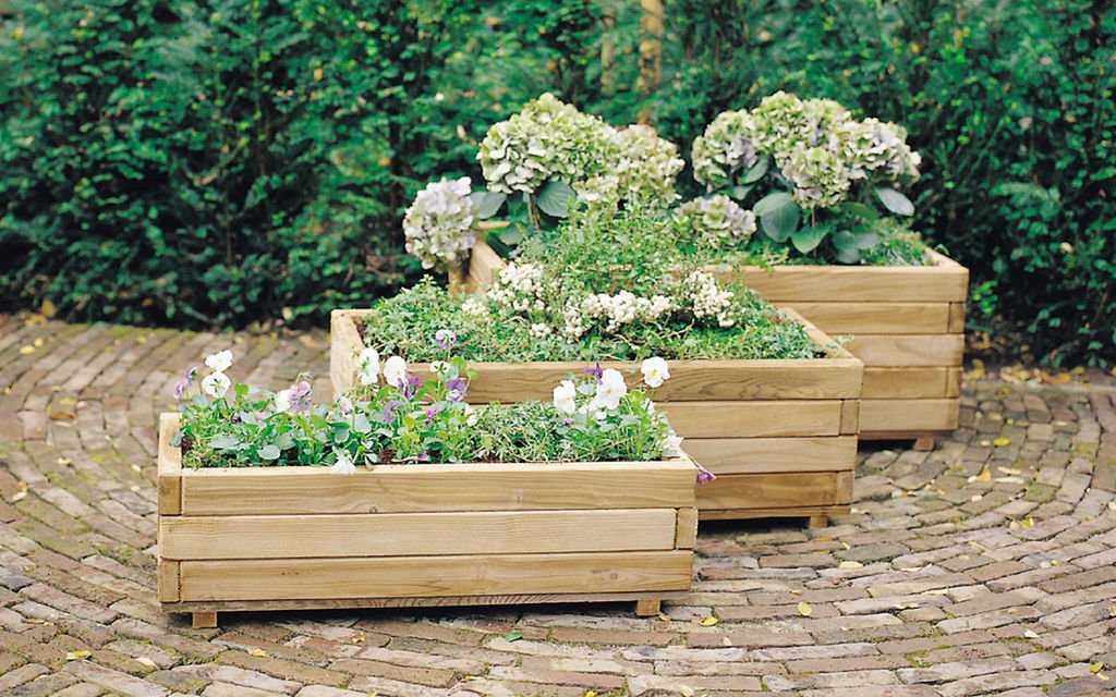 Дерево всегда в достатке на даче, но недостатком будет нестойкость к высокой влажности. Можно устранить эту проблему специальной пропиткой, после чего лаком покрыть емкость. В деревянные изделия высаживают цветы, любящие влагу.