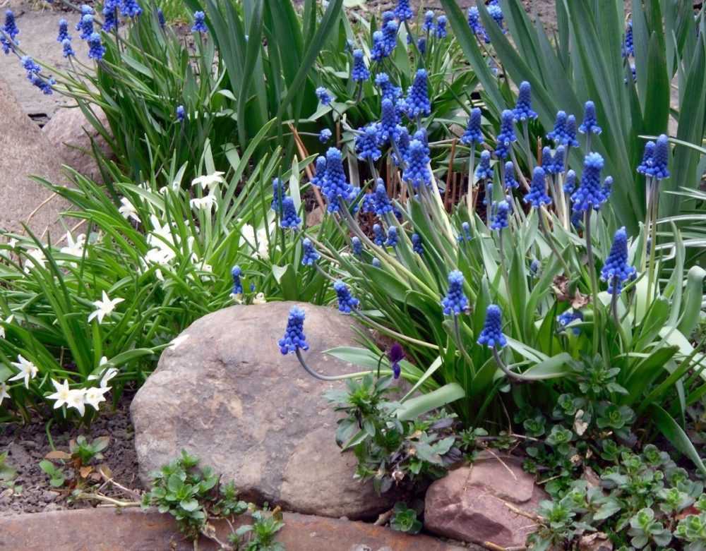 Другие названия – мышиный гиацинт или гадючий лук, — луковичные многолетние, очень неприхотливые, но при этом очень быстро разрастающиеся растения. Сажать можно как на солнце, так и в полутени, под кустарниками, почва – с хорошей водопроницаемостью, луковицы не выносят намокания. Цветы от белого до темно-синего (в зависимости от вида), собраны в плотные соцветия (верхушечные или кистевидные) высотой до 8 см.