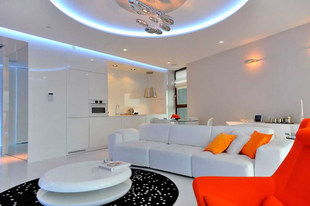 Основным источником света в зале является центральное освещение, это может быть роскошная люстра или ряд точечных светильников, выложенных по периметру помещения. Для классических интерьеров подойдёт первый вариант, а при обустройстве современных квартир следует в первую очередь ориентироваться на предпочтения и материальные возможности жильцов.