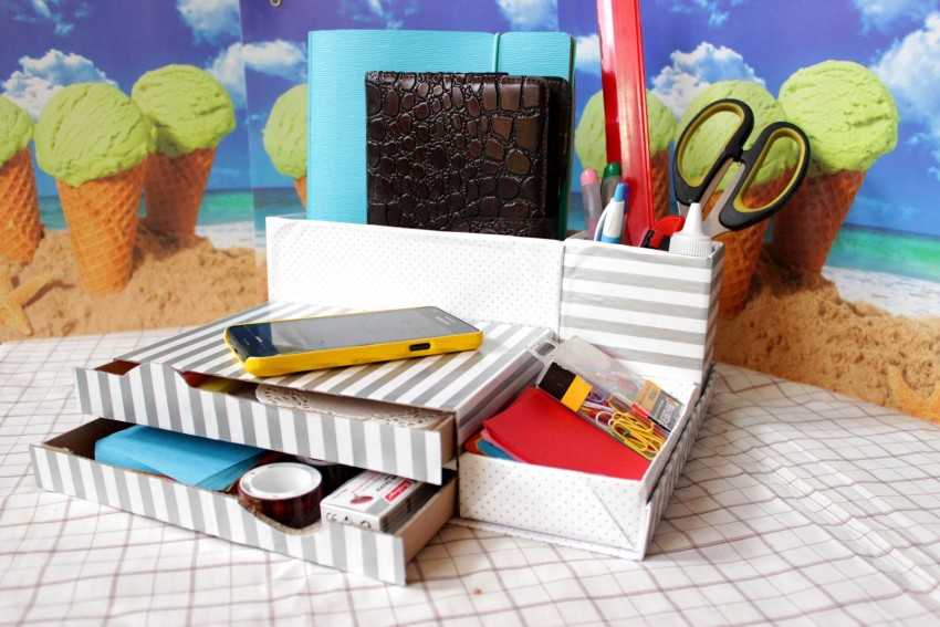 Кроме того, существует ещё масса способов выполнить удобный органайзер из картона, причём не только в виде комода, выдвижных ящиков, а и других конструкций.