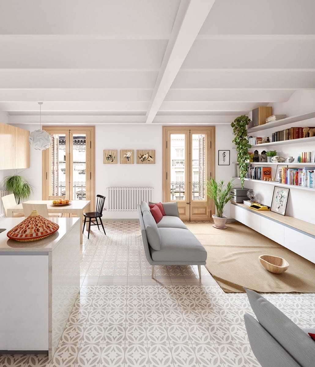 Мебель в гостиной, текстиль и обои должны быть выполнены в светлых тонах. Основной принцип – ничего черного. Материалы должны быть натуральными. Это может быть деревянная мебель, занавески в узорах, чисто белые стены, деревянные столы и полочки и, конечно же, растения.