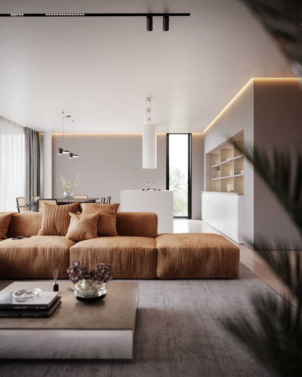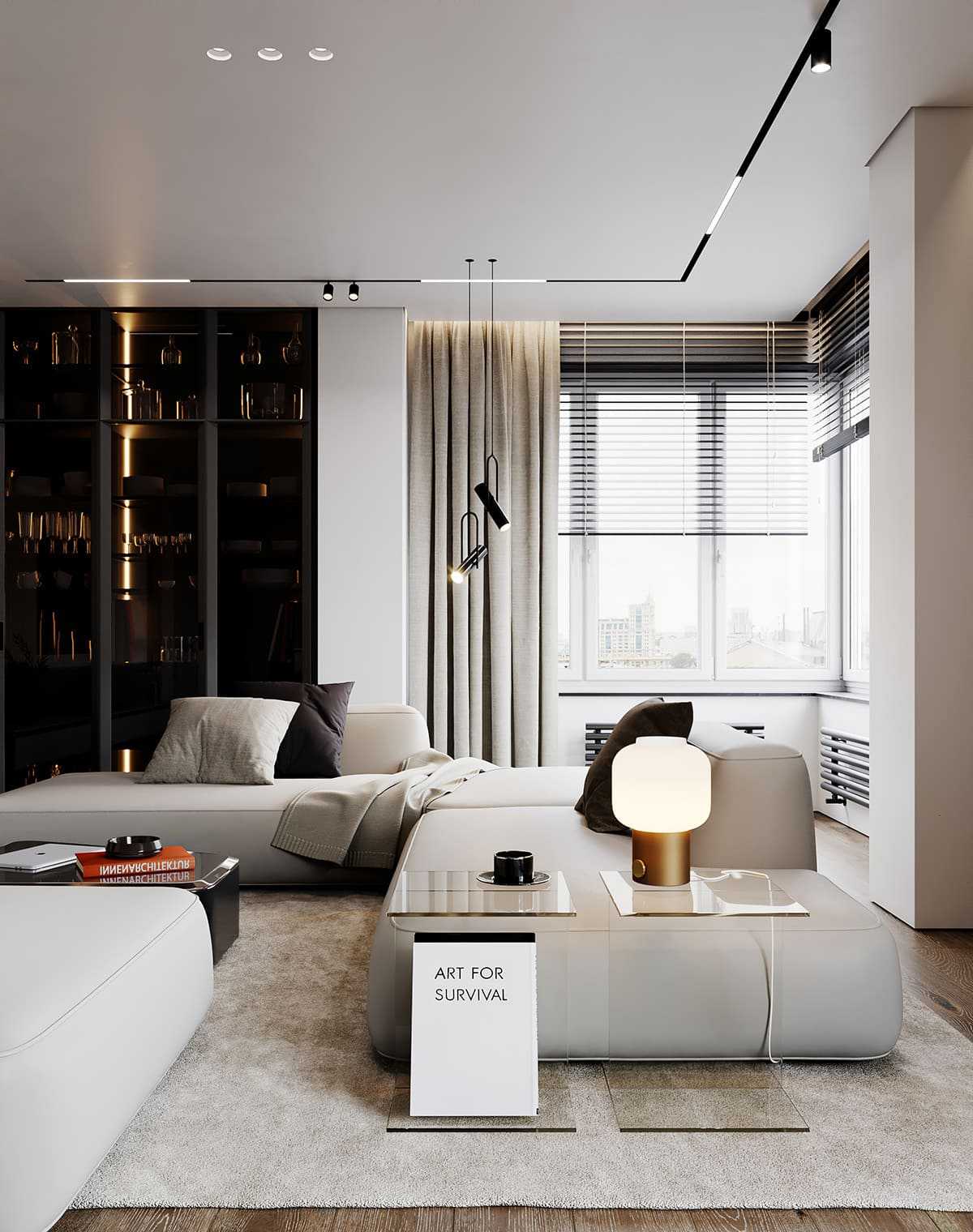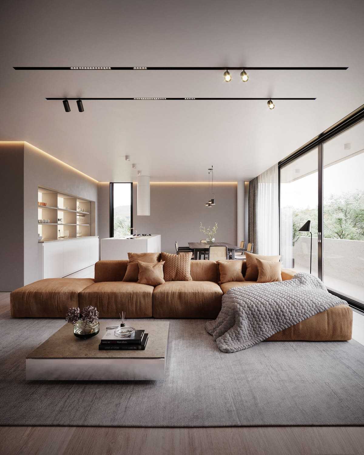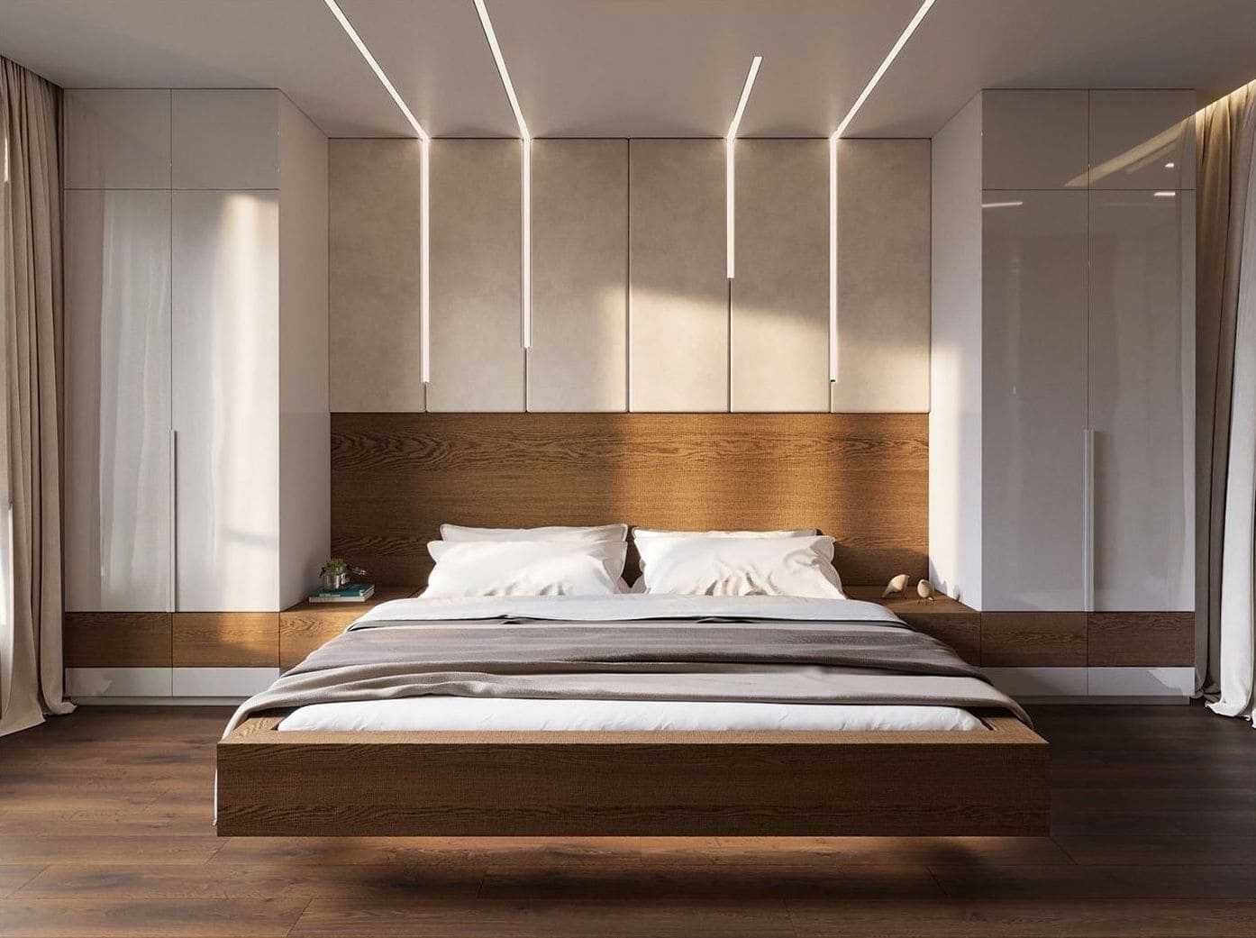 - В скандинавском стиле и в контемпорари верхняя поверхность обычно выполняется белой. Здесь могут присутствовать элементы разной отделки – деревянные балки, рейки, многоуровневые конструкции для организации разных режимов освещения, но цветового контраста вы не увидите.