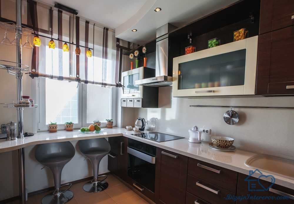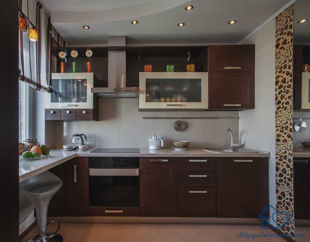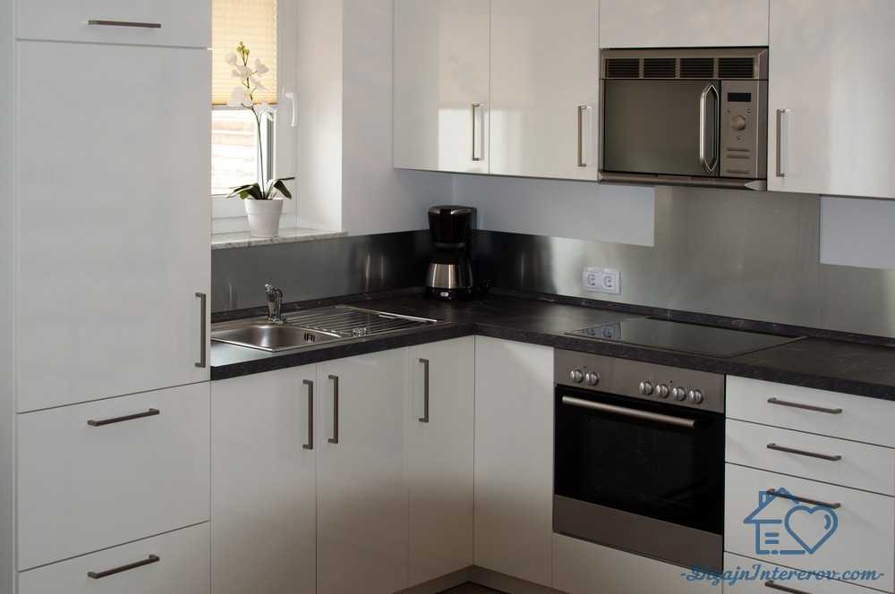 В маленькой кухне светлого цвета мебель в тон обоям не выделяется и кажется, будто она занимает меньше места. Если хочется контрастный темный гарнитур, то подойдет неширокий и максимально высокий, с облегченным верхом в виде полок или шкафчиков с прозрачными дверцами. Он визуально увеличит высоту потолков. Темная мебель не утяжелит дизайн, если потолок, стены, посуда и другие кухонные принадлежности будут светлыми.