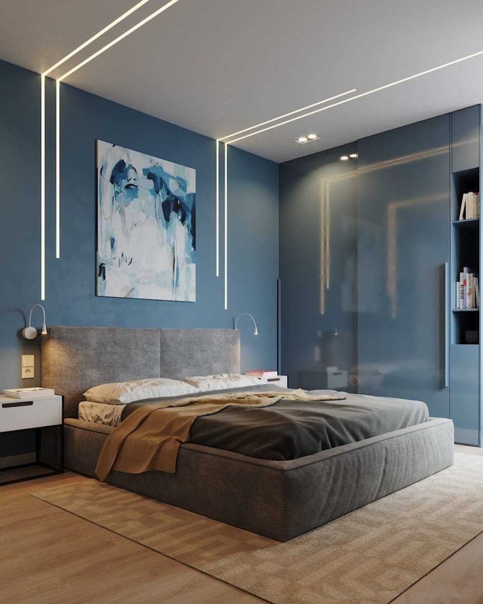 - Синий потолок станет залогом эффектного и стильного оформления.