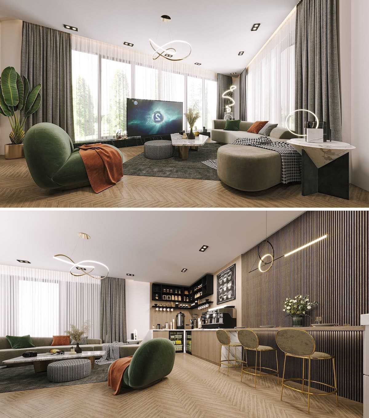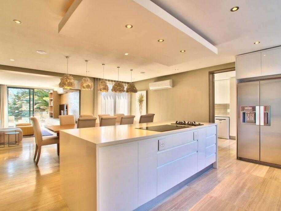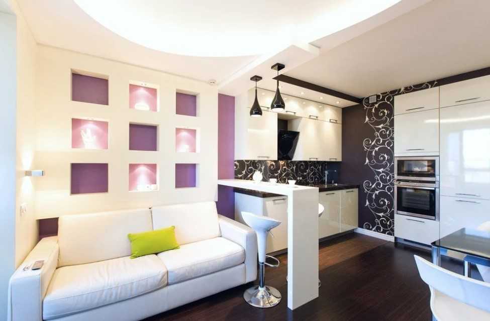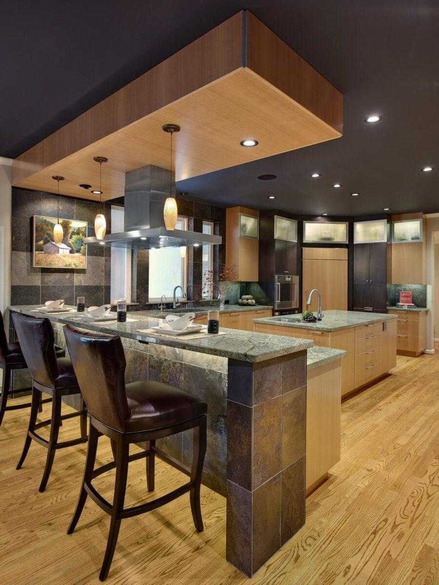 Если пространства в квартире больше, есть возможность разделить кухню и гостиную барной стойкой или островом. На потолке сооружают конструкцию такой же формы, встраивают освещение в плоскость и по контуру.