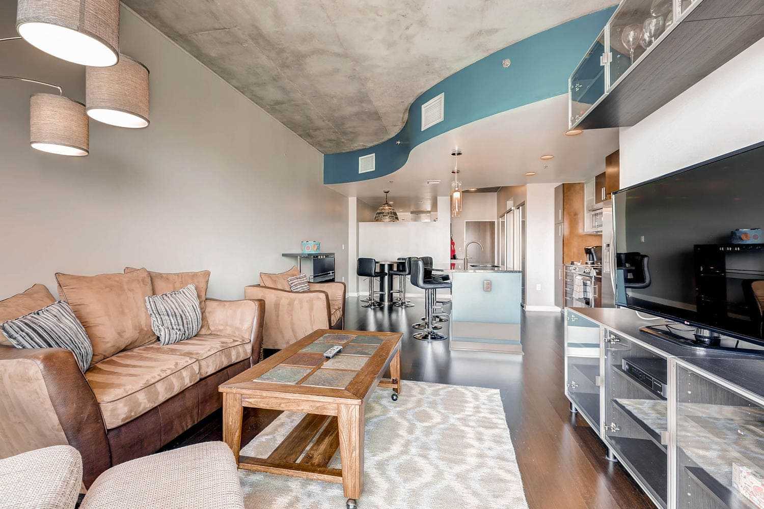 При небольших площадях понижают уровень в области кухни, а над гостиной оставляют повыше. Перепад подчёркивают использованием разных цветов и фактур, диодной подсветкой.