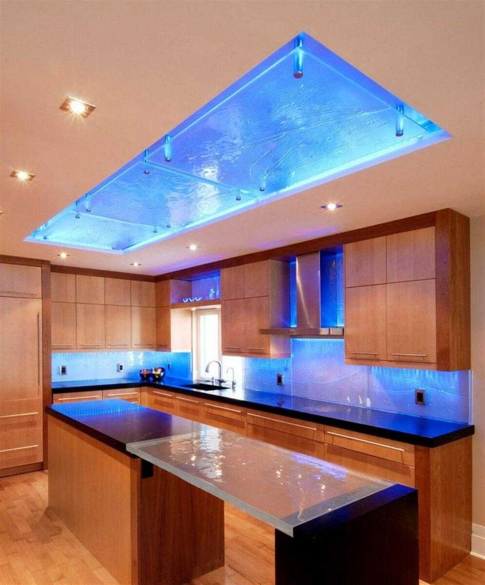 Это важная деталь оформления любой потолочной поверхности, натяжной или из гипсокартона. Свет позволяет изменить пропорции комнаты, подчеркнуть цвет или разграничить пространство на разные зоны, например, кухню и гостиную. Выбор модели светильников и люстр во многом зависит от высоты комнаты. В низких помещениях лучше монтировать точечные светильники, в то время как в высоких выгодно смотрятся подвесные лампы и массивные люстры. Варианты дизайна натяжных потолков с разным типом освещения в интерьере кухне можно видеть на фото далее.
