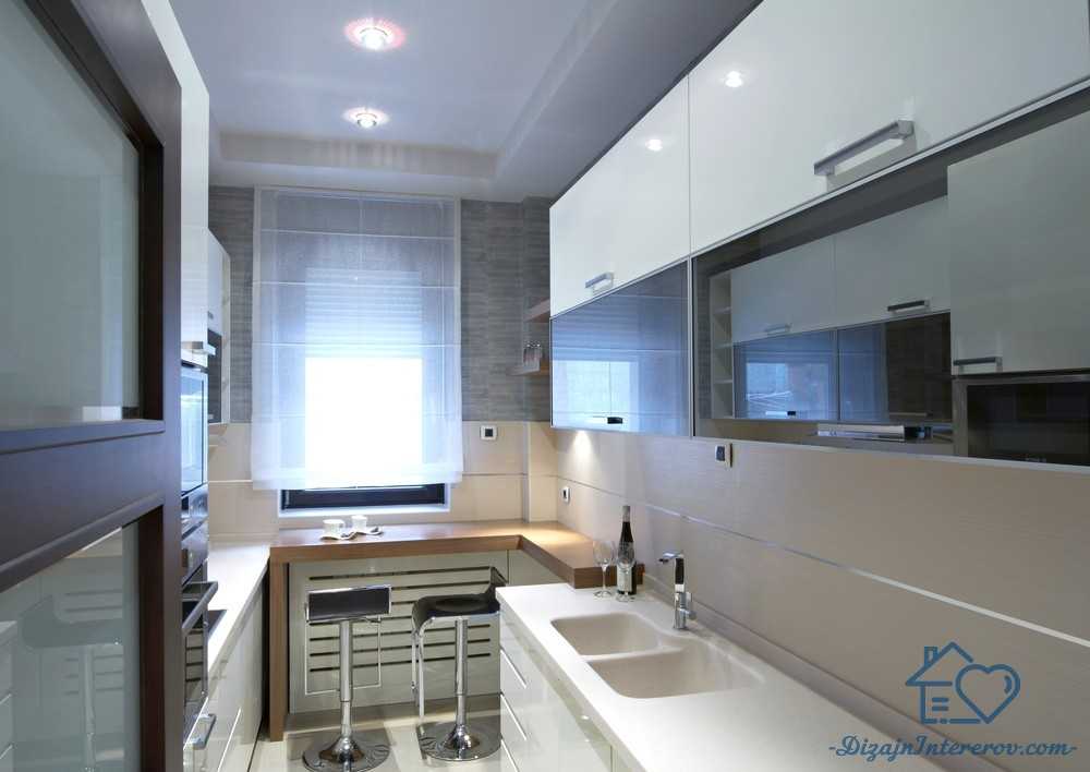 На фото кухня и потолок со спотами, расположенными над рабочей зоной гарнитура.