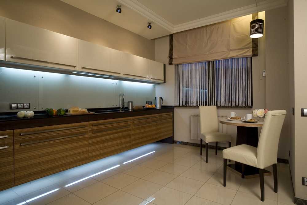 Освещение чрезвычайно важно на прямой кухне, а на современной — незаменимо. Поэтому дизайнеры всегда заботятся о том, чтобы правильно освещать рабочую поверхность, стол и отдельные зоны