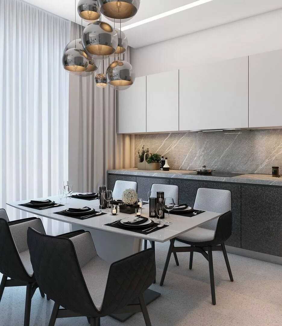 - Модульная черно-белая кухня. Изготовлен из ДСП белого цвета, покрыт черным верхом из искусственного камня. Ручки, напоминающие хлопья льда, выполнены из полупрозрачного пластика. Такое сочетание всегда выглядит эффектно и следует новым трендам. Все, что вам понадобится, это пара двухстворчатых шкафов с дверцами из матового стекла, 3 нижние части, среди которых есть отсек с несколькими ящиками. Прозрачный стеклянный стол и так же невидимые пластиковые стулья делают интерьер невесомым. Не нужны шторы — только прозрачные окна, которые хорошо пропускают свет. А можно ограничиться шифоновой паутиной без цвета. Люстры, состоящие из нескольких светильников, напоминают перевернутые стекла, закрепленные на фрагменте пещерного камня.