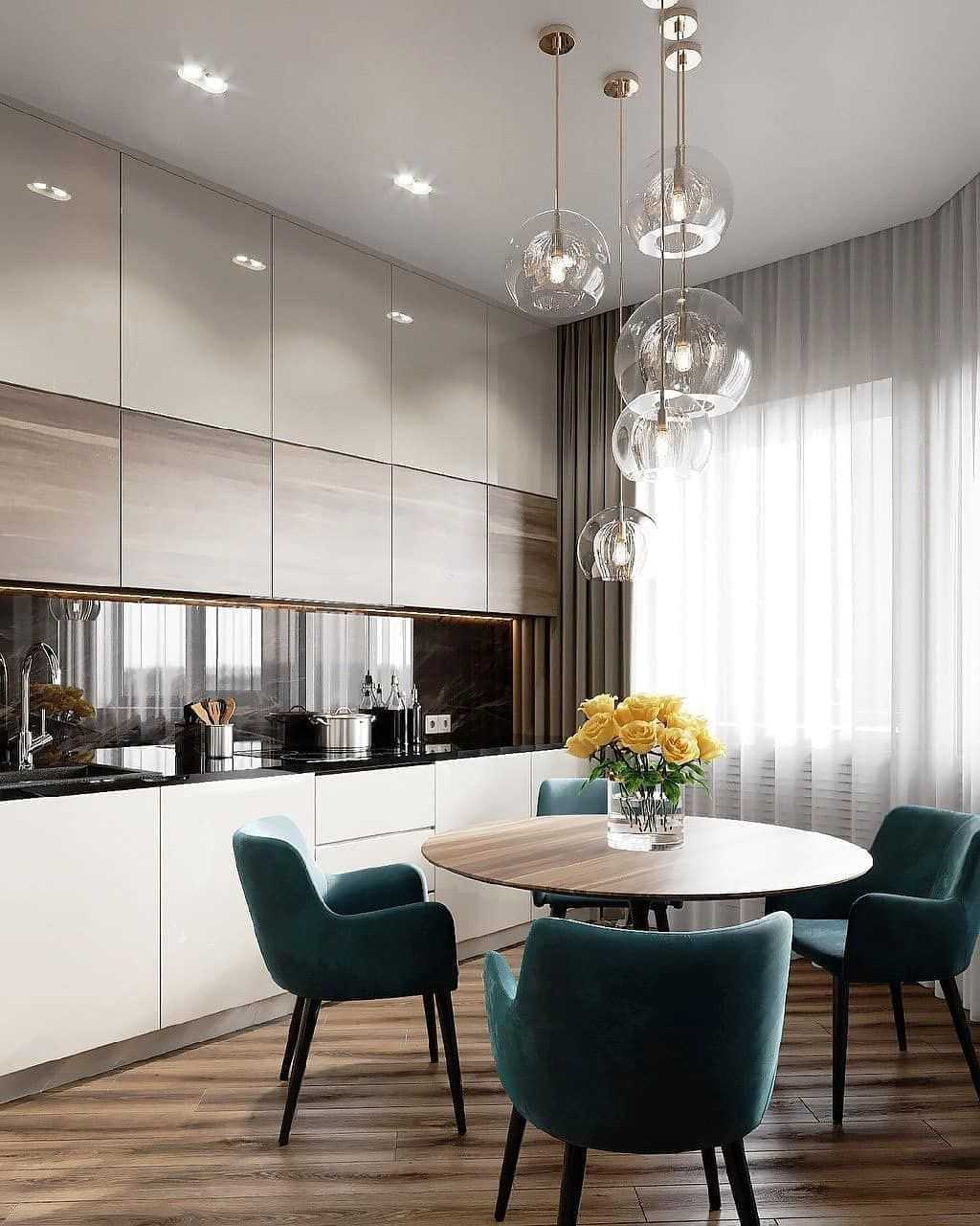 Стекло по-прежнему удерживает свои низкие позиции. Его использование в интерьере придаст кухне легкости и воздушности. Вы также можете проявить творческий подход к текстуре и цвету стекла. Стекло отлично преломляет свет, что является одной из ключевых особенностей новых тенденций.