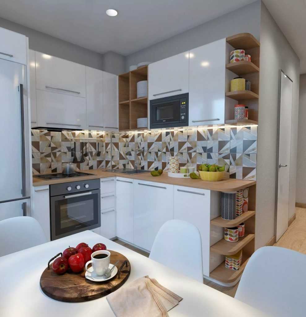 - Нет навесных шкафов из МДФ. 4 отсека с одинарными дверцами цвета мокрого камня, покрытые верхом из массивного ЛДСП, напоминающего свежий срез дуба. Ручки выполнены в тех же цветах, что и нижние шкафы. Стены облицованы плиткой, напоминающей белый кирпич, с такими же чистыми белыми швами. Квадратный стол — брат-близнец столешницы из аналогичного материала с серыми хромированными ножками, нагруженными угловой геометрией. Кресла обиты льняной тканью мышиного цвета с черной хромированной опорой. На окнах ставни-трансформеры со вставками из золотистых капроновых лент. Потолок оформлен рассеянным точечным светом.