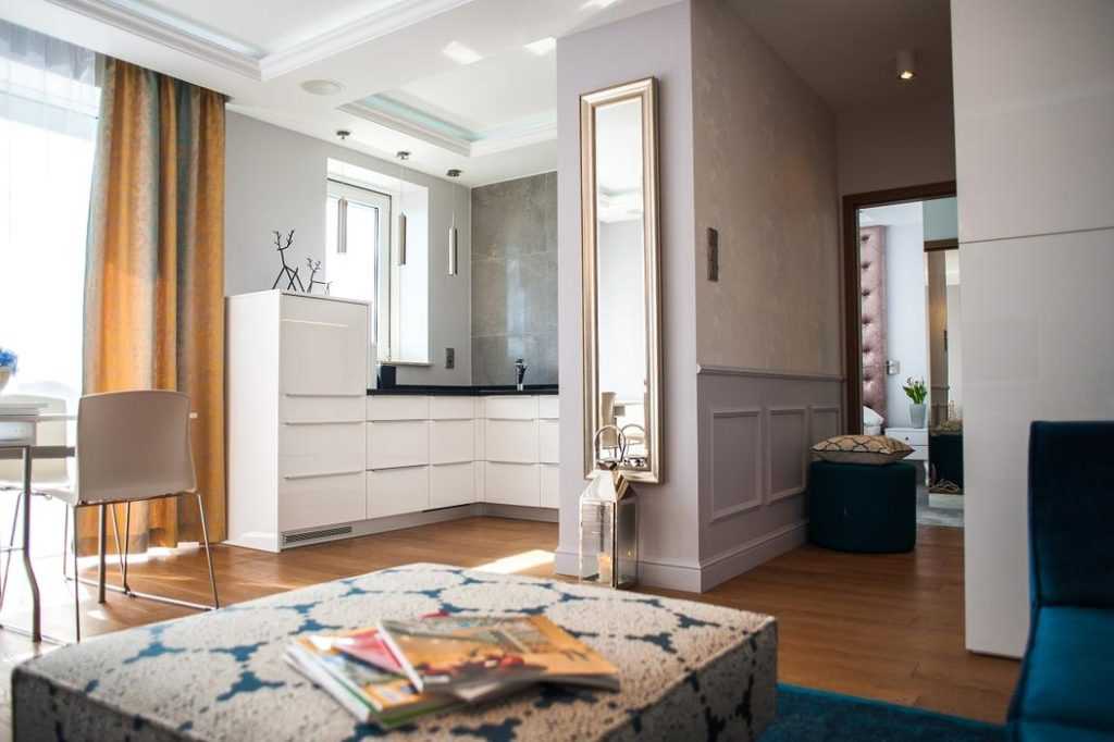 Припудренные пастельные тона стен и кресел – прекрасный антураж для более ярких цветовых акцентов. Лакированное розовое подстолье с золотой каймой – эффектный компаньон для белой мраморной столешницы. Темные розово-сиреневые стены в спальне – удобный фон для белых фоторамок и медного зеркала.