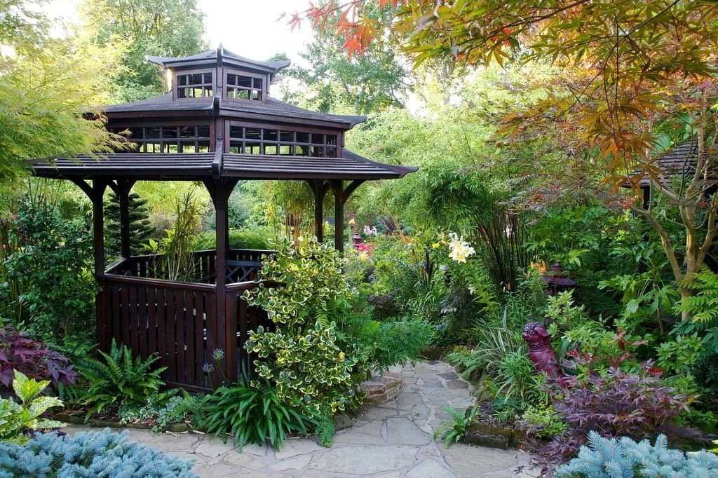 Стиль востока — экзотическое оформление для дачной беседки. В основе может быть настоящая китайская пагода с легкими стенами и многоярусной крышей. В декоре приветствуется наличие подушек и абажура, а также множество китайских фонариков.