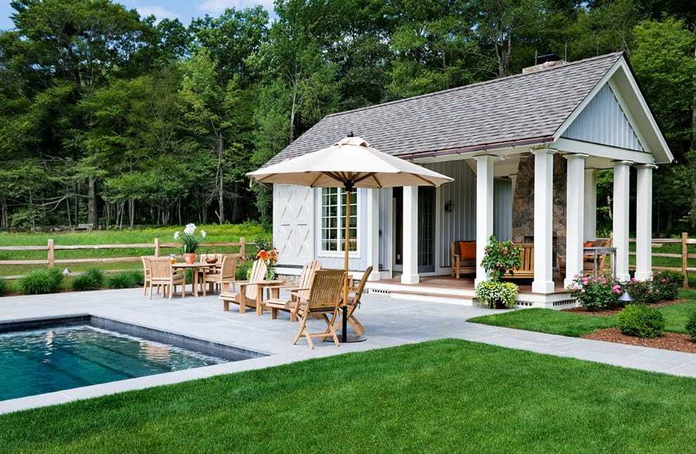 Классика — ничего лишнего, все лаконично и строго. Беседка обычной формы, прямоугольника, без дополнительного декора, обставленная самыми простыми предметами мебели. Это простой вариант для дачи, где планируется проводить мало времени и не устраивать частых долгих посиделок.