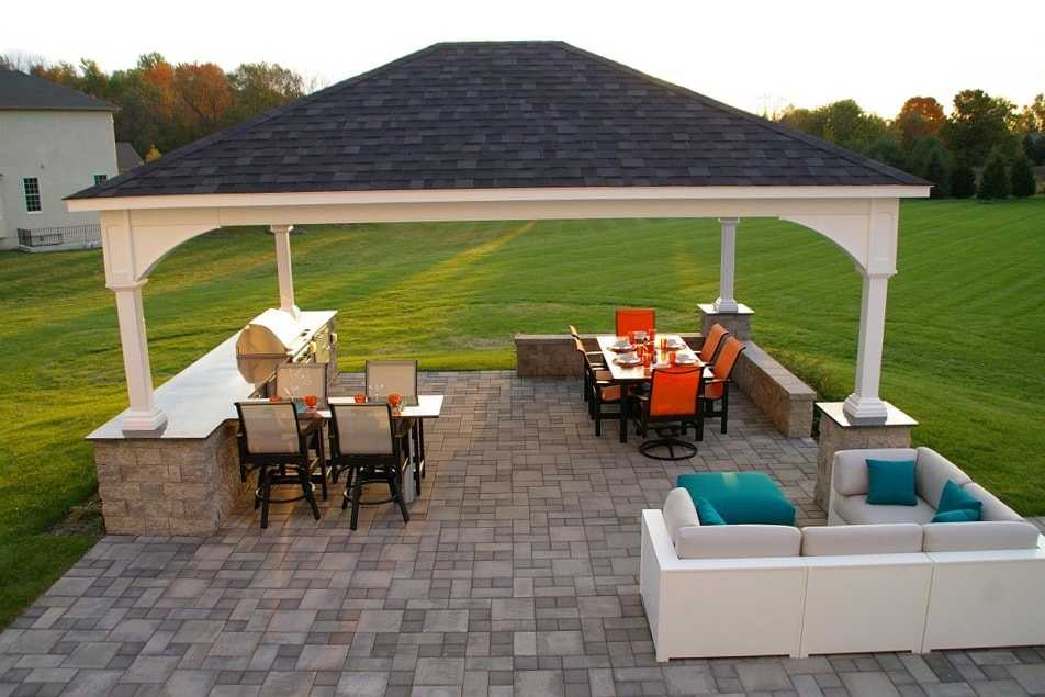 Под покрывалом навеса приятно отдохнуть не только летом, а и в холодное время года. Для удобства отдыха, рядом с беседкой устанавливают печь-камин или мангал. А чтобы защитить строение от ветра, монтируют вертикальные экраны из поликарбоната.
