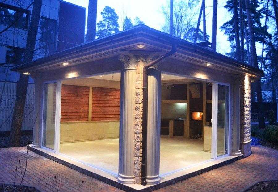 Строительство беседки может быть очень простым: четыре столба и крыша на их основе, под которой можно установить садовую мебель. Другое обогащение конструкции, полезное, если вы хотите создать интимный интерьер, — это размещение решеток между колоннами, которые представят собой ажурные стены. Вы также можете построить такие стены в нижней части беседки. Они защитят от ветра, и в то же время станут опорой для скамей. Если вы хотите использовать малую архитектуру сада не только в теплые летние дни, то можете поставить сплошной павильон с застекленными окнами и дверями, которые закрывают вход. Тогда прохладный ветер или дождь не будут страшны.