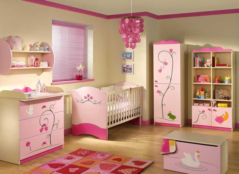 Розовые оттенки остаются традиционными для девочек. Но не исключается использование других цветов. Если малышка слишком активна, то цветом можно скорректировать её эмоциональный настрой. Возможно сочетание разных цветов – это добавит задор и энергичность. Интересным будет оформление рисунка на стене в детской доченьки.
