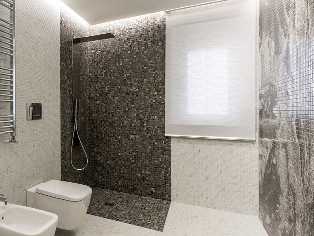 Цвет и фактура мозаичной плитки играют значительную роль в разделении площади на зоны. Светлое глянцевое покрытие лучше использовать для функциональных зон – душа, ванны, зеркала, полотенцесушителя, туалета