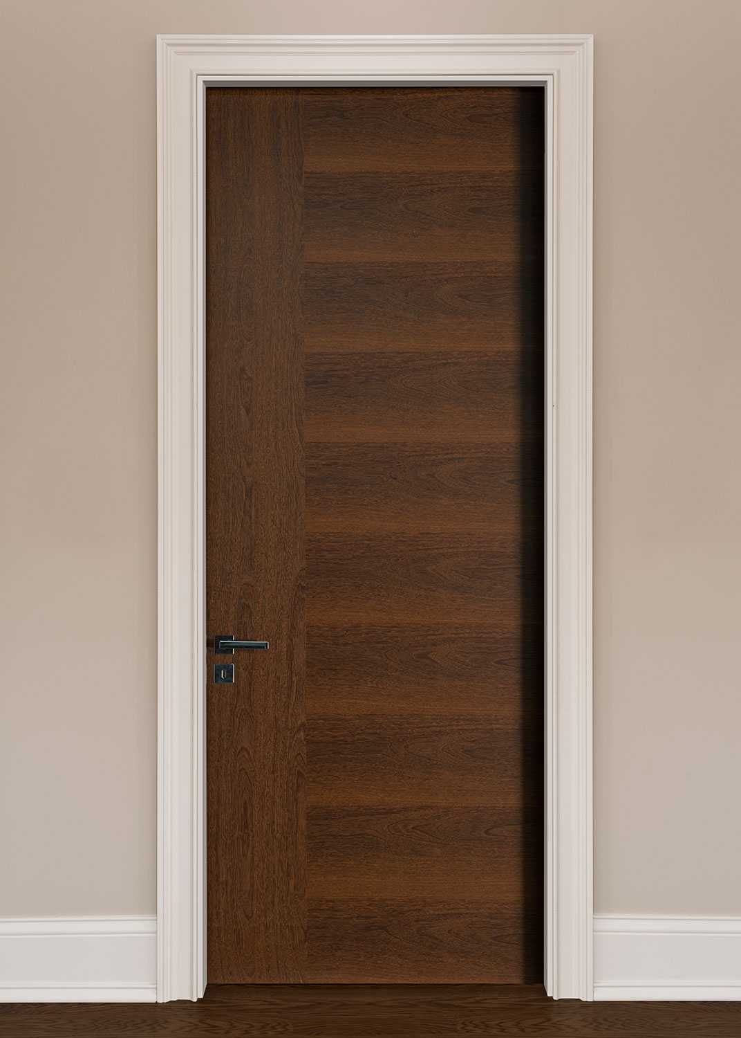 Темный орех выглядит достаточно светлым и не скрадывает пространство. При установке дверного полотна и пола лучше сделать одинаковое направление древесных волокон на рисунке.