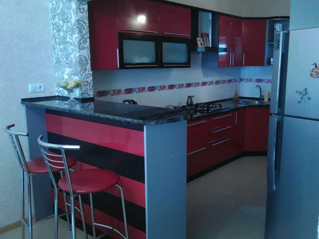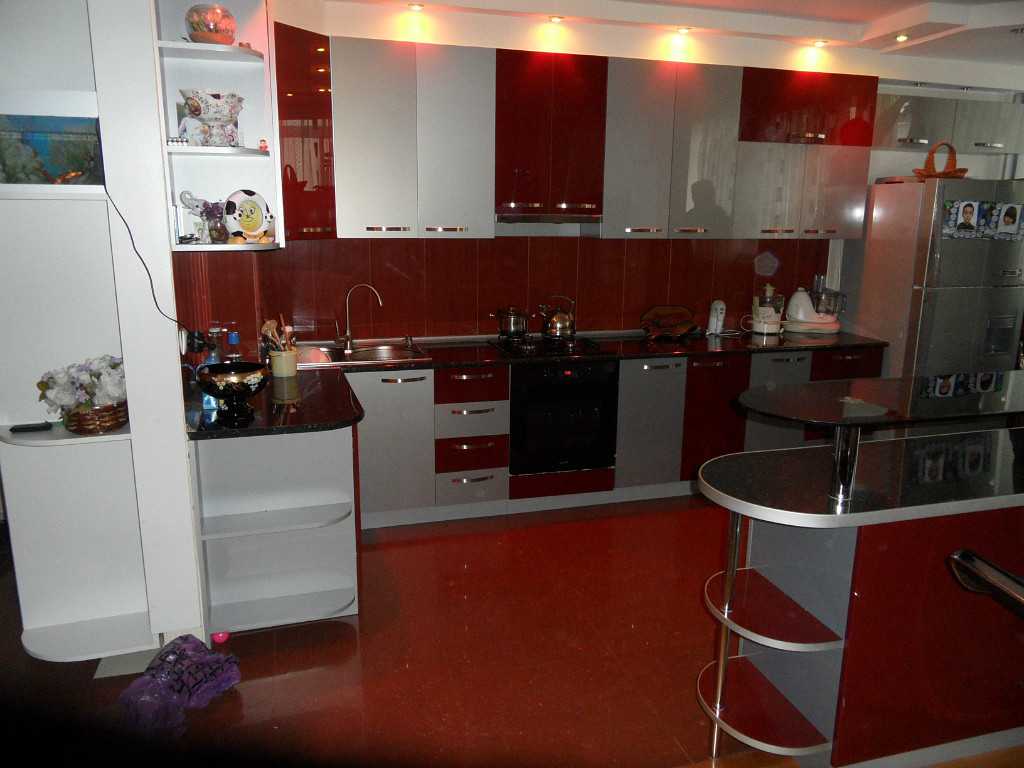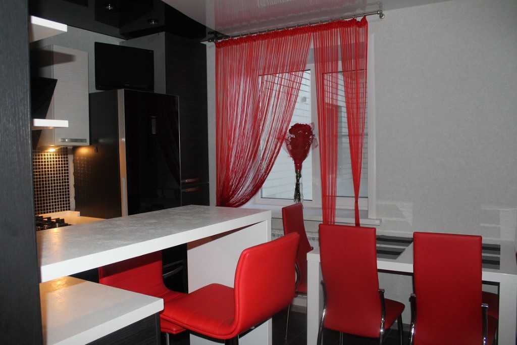 Красный. Яркий фон внесет свежесть в пространство. Люстры, шторы, стулья, кухонные приборы, придадут интерьеру динамичности