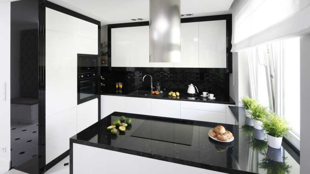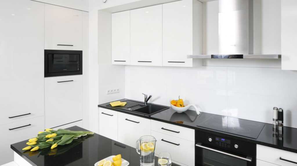 Белая кухня с черной столешницей – универсальное сочетание для многих направлений. Подходящий вариант выбирают исходя из площади кухни и личных предпочтений.