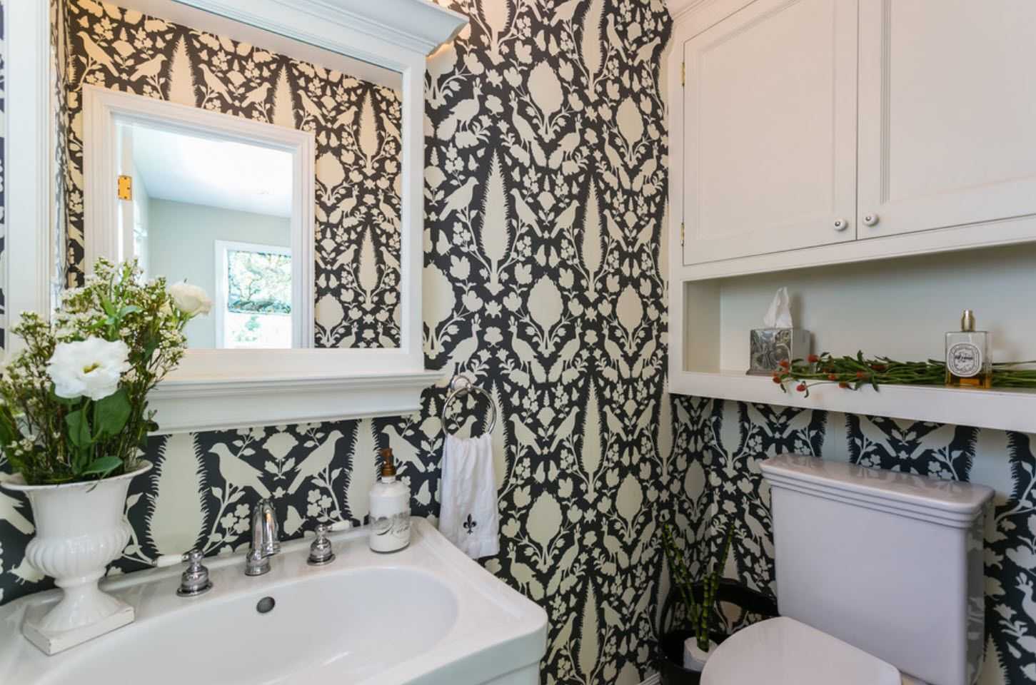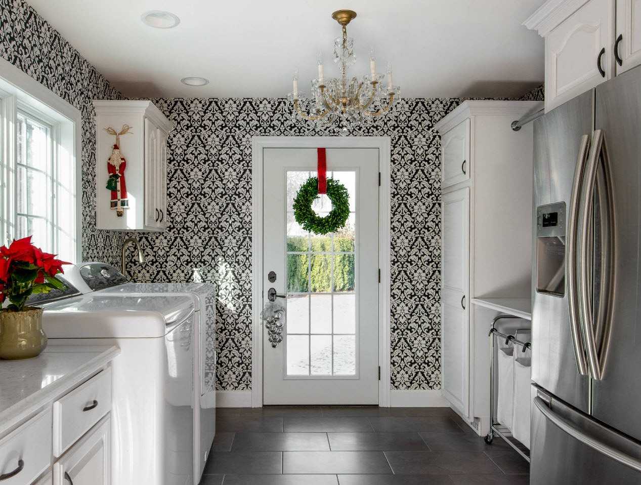 Обои в черно-белом цвете также могут появляться на кухне или в ванной комнате на стене, которая не имеет прямого контакта с водой.