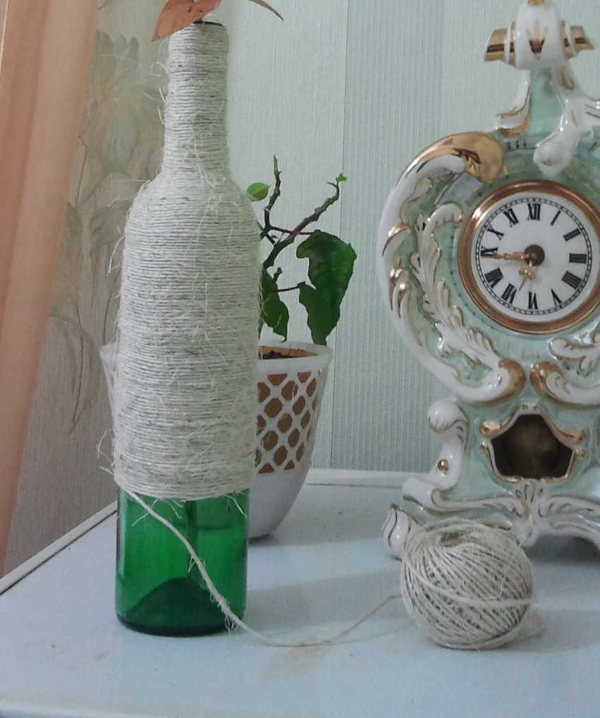 Бутылку можно обмотать разноцветными шерстяными нитками, или просто бечевкой. Сверху дополнительно украсить мелким декором, бантиком, ленточкой, ракушками. Сверху покрыть кружевами.