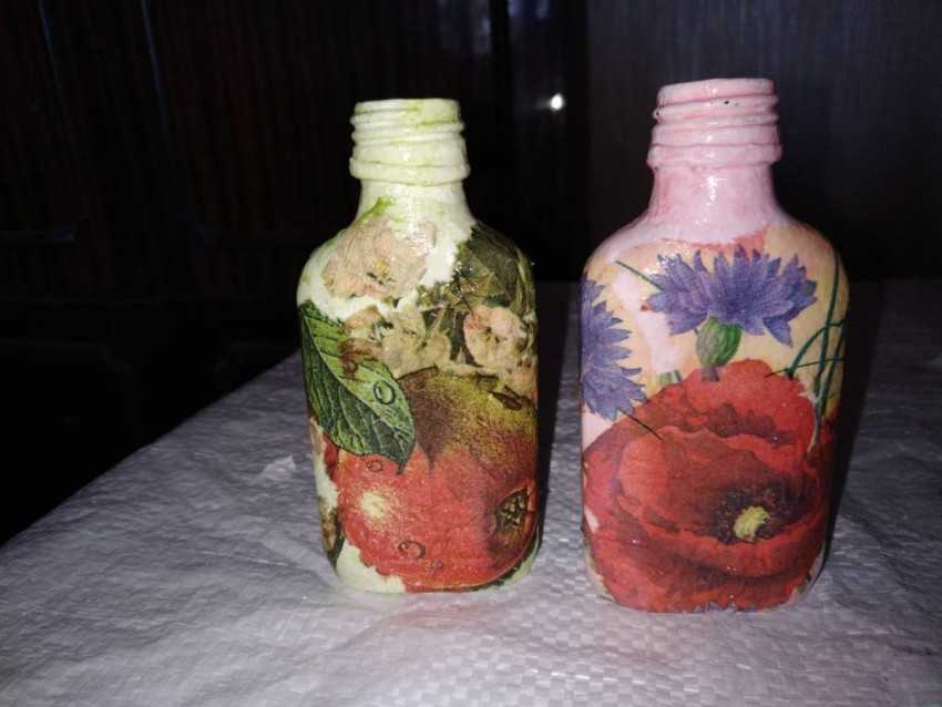 Чистая и обезжиренная бутылка декорируется пропитанной клеем тканью, капроном либо мешковиной. Высушив, окрасьте ее белой акриловой краской. Вырежьте понравившийся элемент салфетки, ее верхний слой поместите на нужное место, и покройте слоем лака.