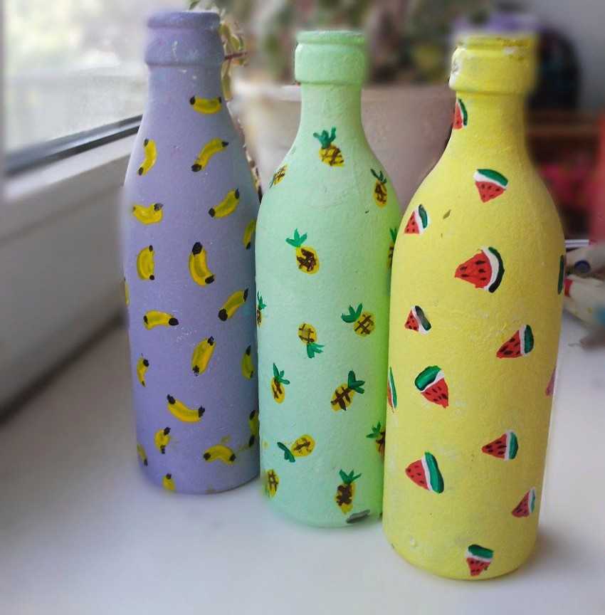 Можно добавить внутрь маленькие овощи, фрукты. Насыпать цветной песок или окрашенную соль. Налить внутрь краску и распределить по внутренней части бутылки.