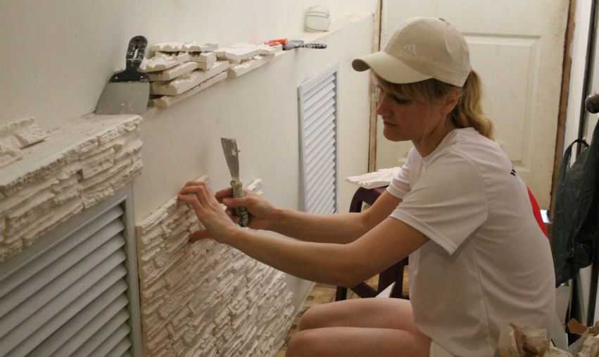 Если используется декоративный камень из гипса, то края плитки можно обработать напильником или ножом. Благодаря этому кладка получится более ломанной и приобретет естественный вид.
