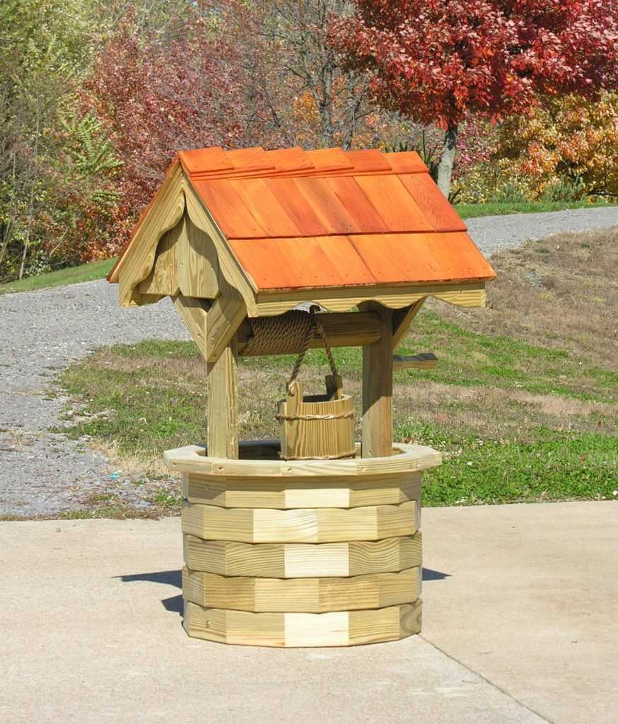 Кровля изготавливается из досок, черепицы, соломы, дранки. Декоративное оформление колодца на даче предполагает резную инкрустацию, которая улучшает внешний вид, придавая сооружению неповторимость. Стойки, барабан, колеса (если конструкция не предполагает коловорот) также деревянные, а вместо ведра – бондарская бадья.