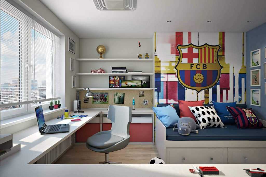 Популярная идея дизайна небольших комнат для мальчиков спортивная тема. Она подходит почти для всех ребят, а особенно тех, кто увлекается данным направлением. Комната наполнится положительными эмоциями, поэтому в ней весело и комфортно.
