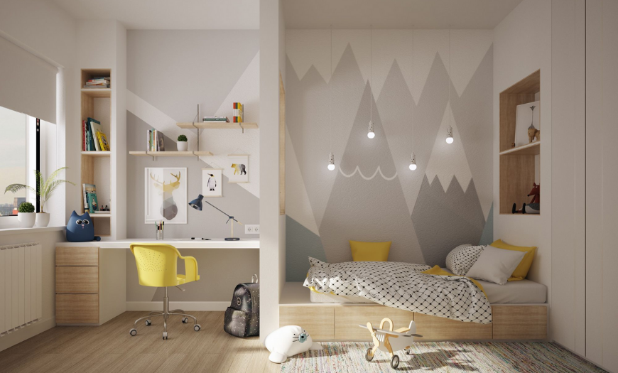 В комнате должно быть место для игры, для отдыха, и для занятий. Разграничить эти зоны можно при помощи разных уровней, освещения, обоев и мебели разных цветов