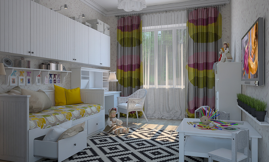 Для девочки, главное, предусмотреть достаточно мест для хранения игрушек и вещей. А для мальчиков — можно сделать спортивный уголок или что-то подобное. Обстановка для младенца и подростка, конечно, будет отличаться.