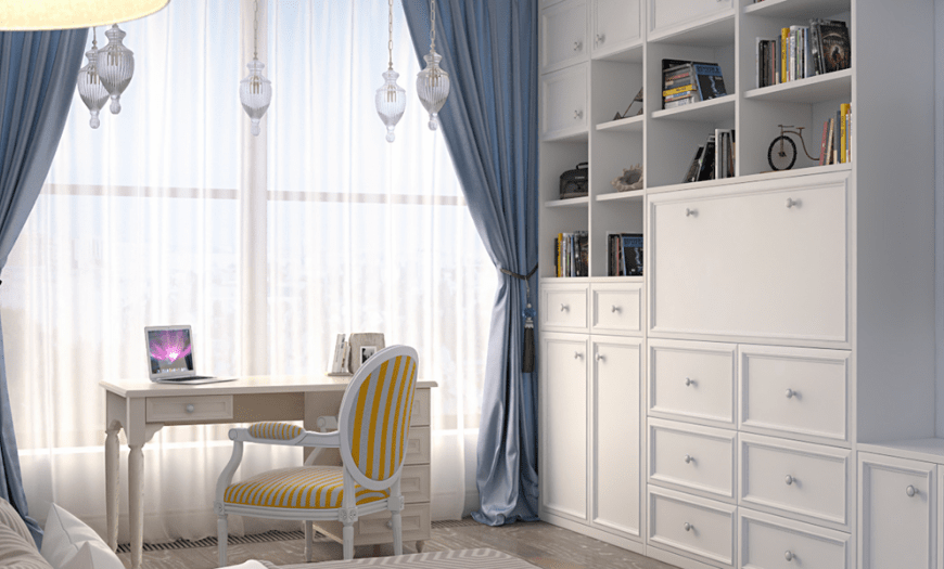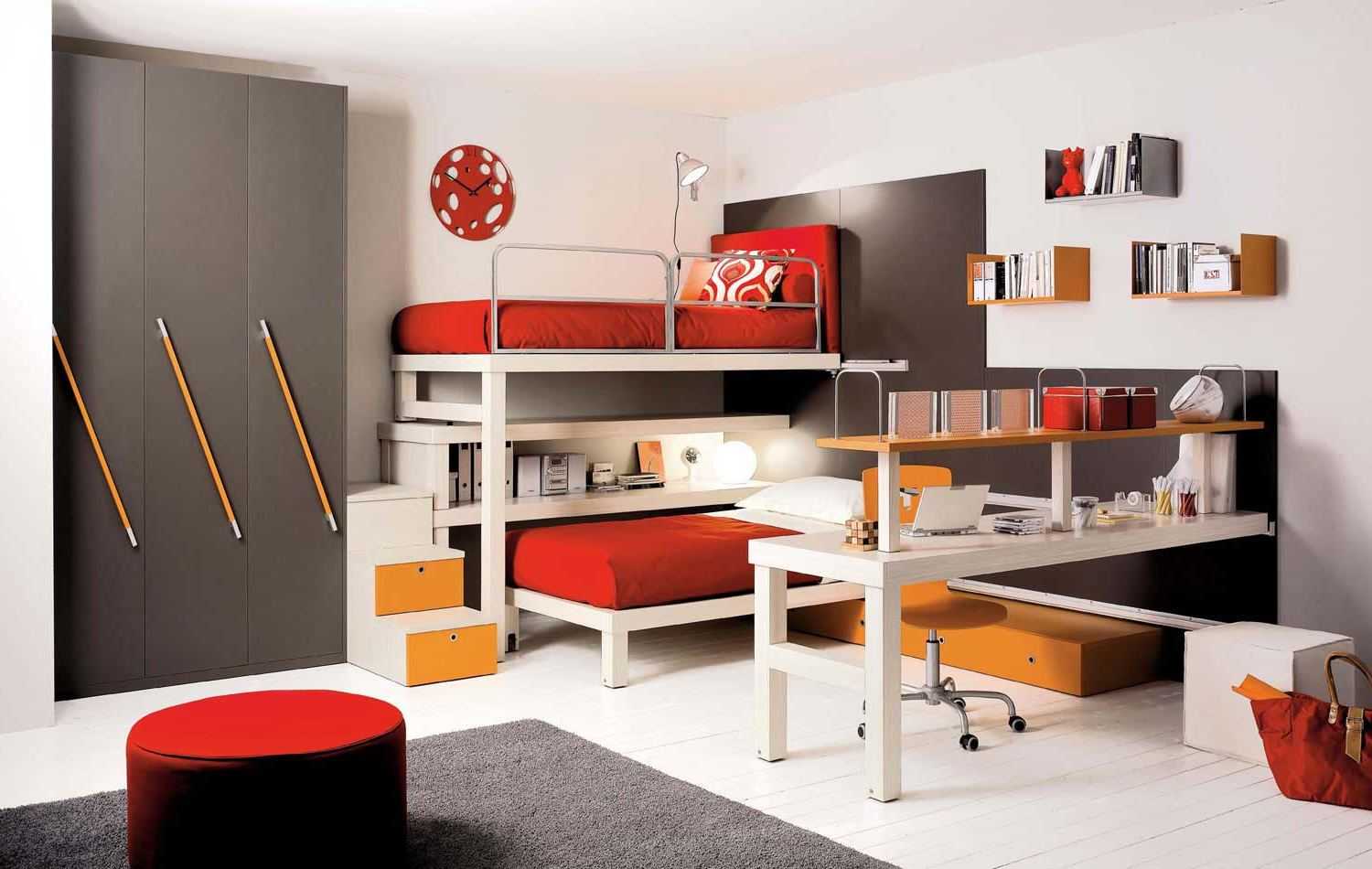 - Чтобы спальня была максимально функциональной, ее обустраивают напольными стеллажами или навесными полками. Обязательно добавляют небольшой шкаф-купе для хранения школьной и повседневной одежды.