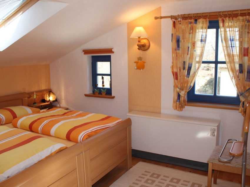На фото узкая деревянная кровать в детской, расположенной на мансарде.