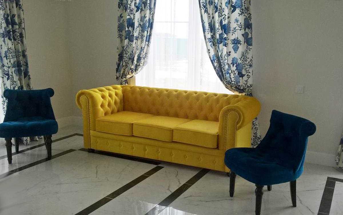 - Лучше остановить выбор на приглушенных темных тонах или на светлых нейтральных. Красный, малиновый или желтый честерфилд будет выглядеть крайне нелепо.
