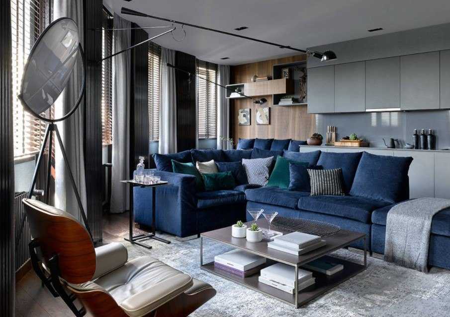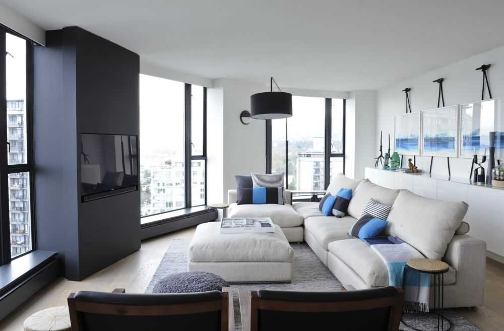 Черно-белая гостиная с синими акцентами