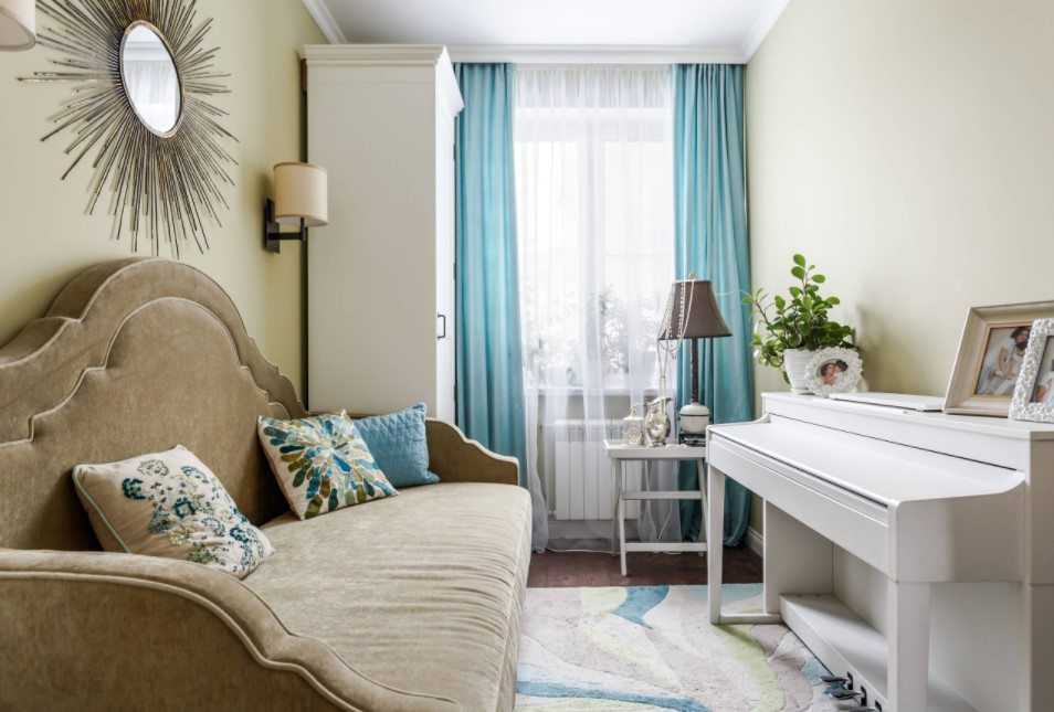 Тут шторы должны быть максимально близкими по тону к цвету комнаты. Не обязательно выбирать цвет полностью сливающийся со стенами, можно взять другой оттенок одного и того же цвета или же внести немного орнамента