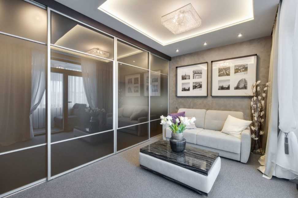 Что касается мебели, то она должна быть удобной и функциональной, лишние предметы лучше убрать. Разделяя небольшую гостиную на зоны можно использовать ширмы и перегородки, стеклянные или зеркальные элементы. Визуально увеличить пространство позволяет зеркала и глянцевые поверхности, натяжной потолок.