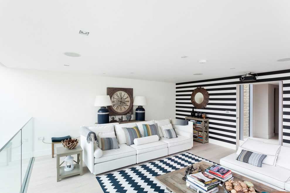 Если помещение узкое, то на стенах используют вертикальные полосы, а для оформления квадратных комнат применяют отделку с продольной широкой полосой.