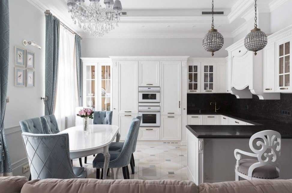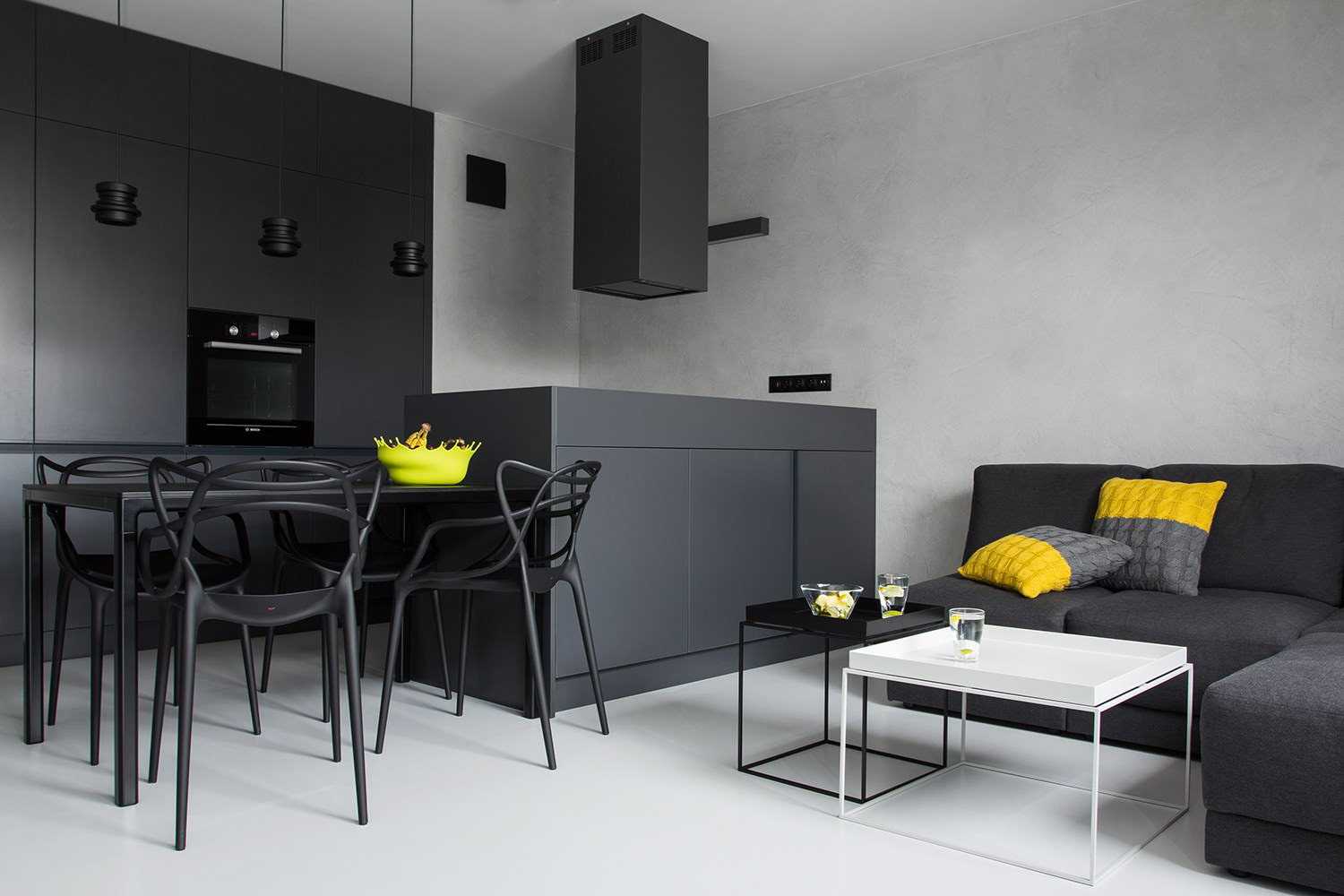 Черно-белая гостиная-кухня с кремовыми акцентами