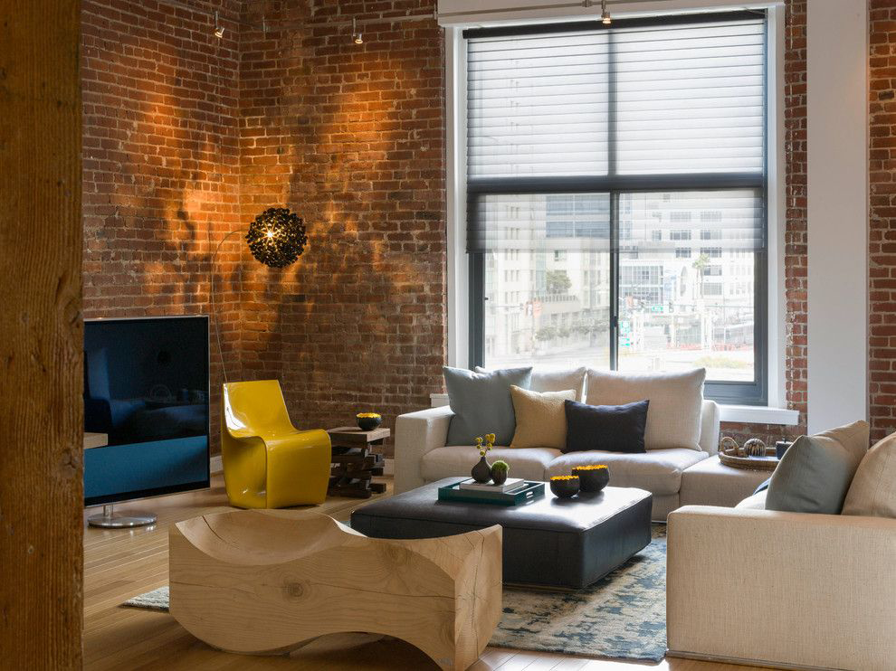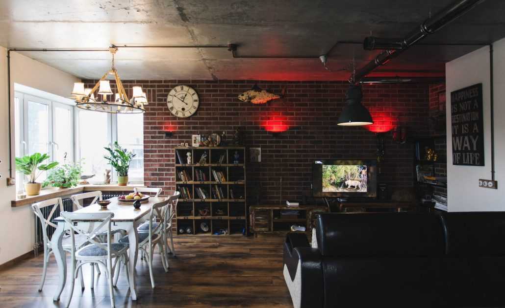 Для лофта характерна брутальность, поэтому стену декорируют имитацией кирпичной кладки, на потолке могут быть сделаны балки, а мебель нередко имеет признаки старости. И все это комбинируется с индустриальными элементами.