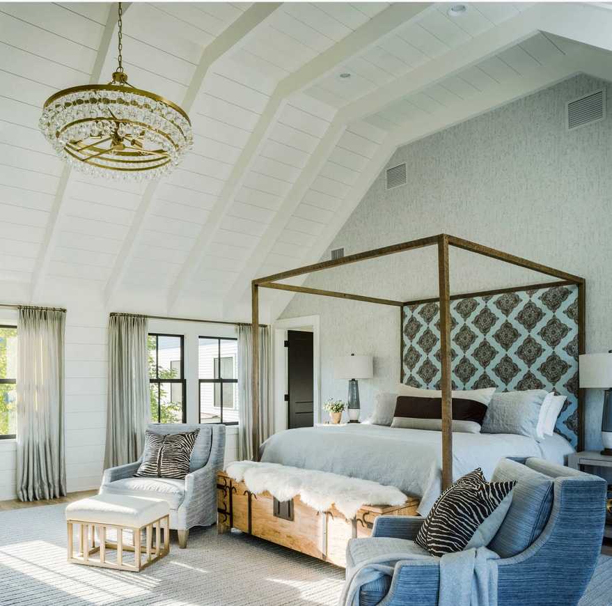 Классические каноны дизайна предполагают создание небольшой зоны отдыха, где внимание будет акцентировано на кровати с роскошными подушками, текстилем и украшенную балдахином. При создании зоны для приема гостей используют современную интерпретацию классического стиля