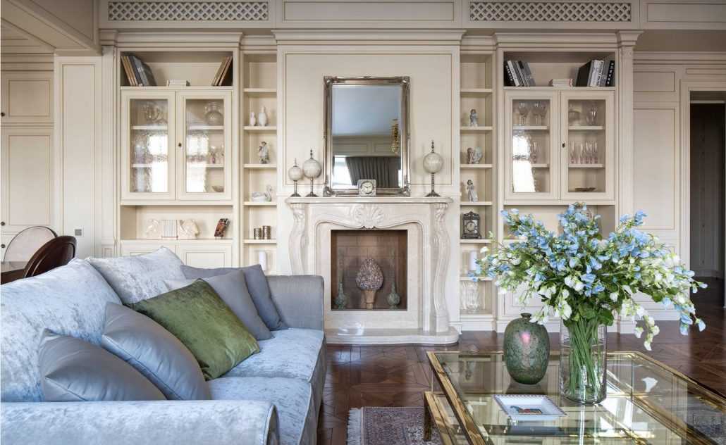 - Мебель. Предметы мебели лучше разместить по краям зала. Большинство предметов классической мебели украшено объемными элементами и имеют крупные размеры. Чтобы справиться с этой проблемой, были разработаны классические модели в более лаконичной современной форме.