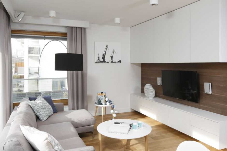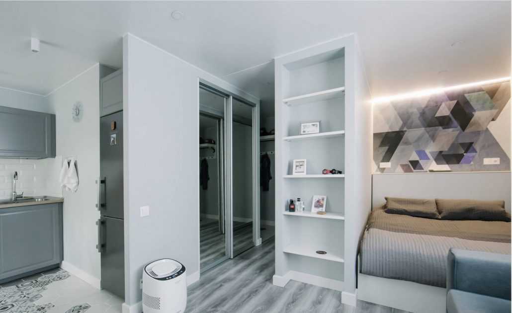 Еще один прием грамотного обустройства помещения такого типа предполагает использование шкафов-купе, а также раздвижных дверей на входе в гостиную.