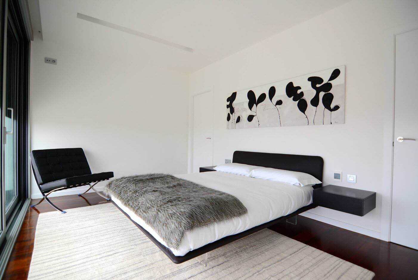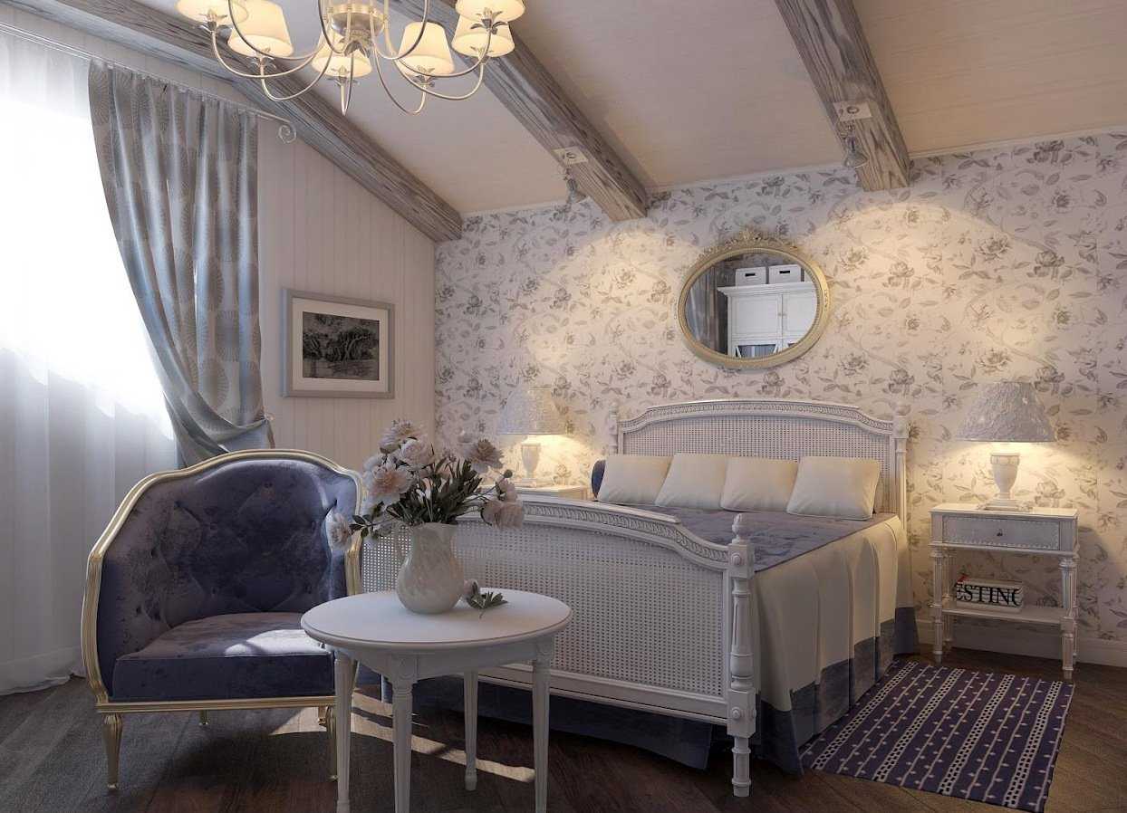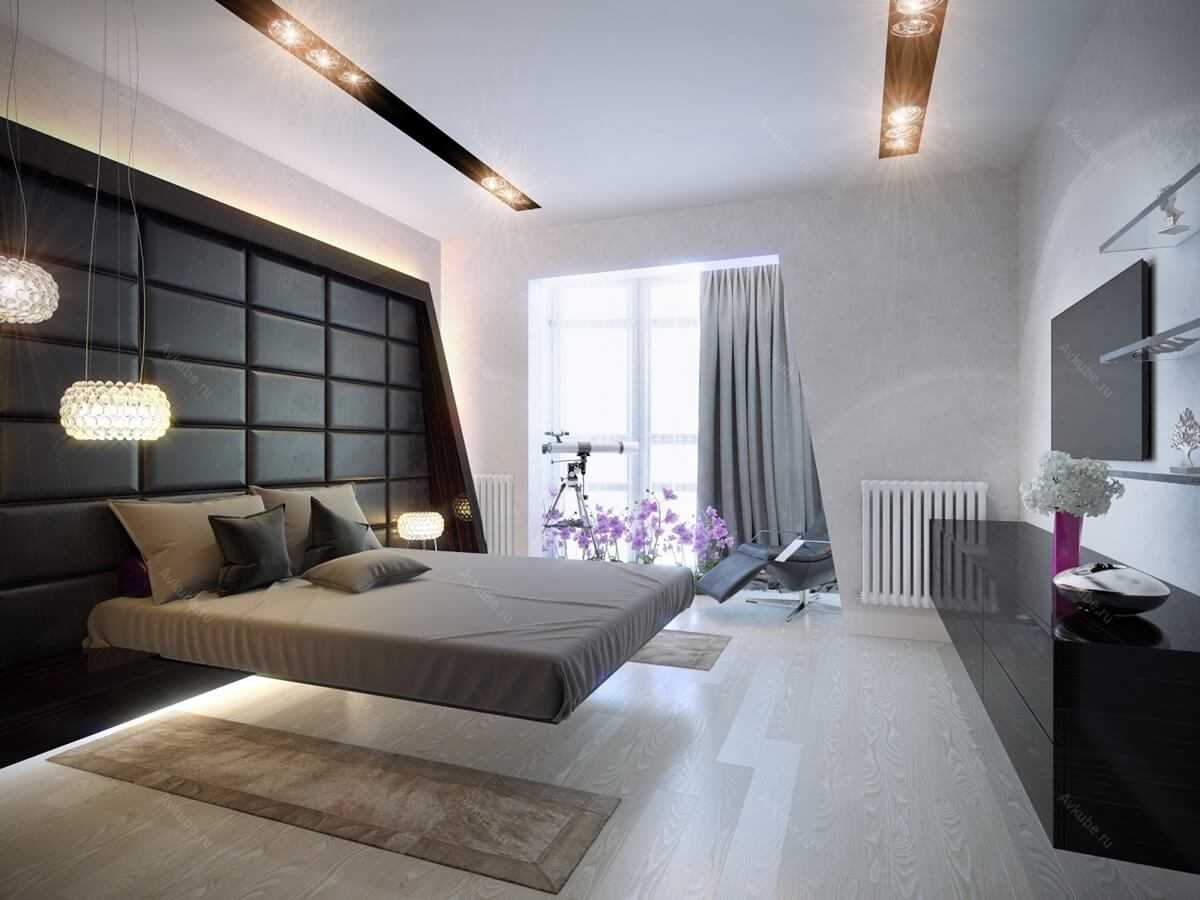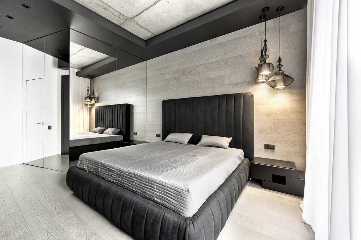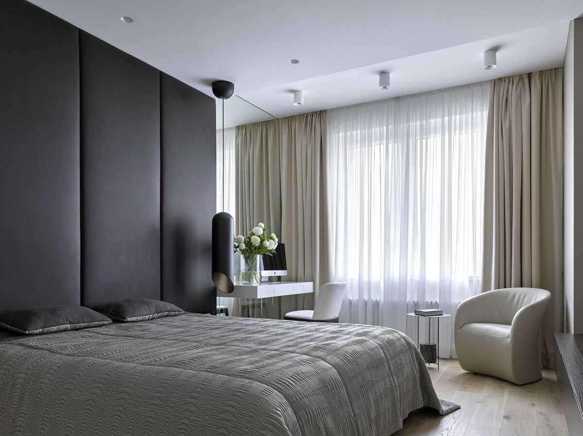 Кстати, несмотря на то, что фавориты стиля – краски прохладные, индифферентные, потолок допускается сделать более теплого, бежевого или песочного цвета. Это «согреет» спальню, окутает её уютной поволокой.